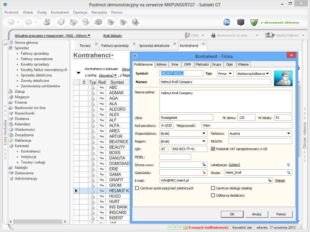 - prowadzenie kartoteki kontrahentów, obejmującej również informacje typu CRM; możliwość definiowania rubryk z dodatkowymi informacjami;