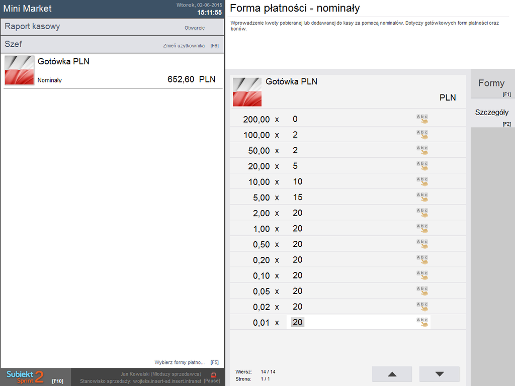 - Możliwość pobrania części utargu (wypłaty) w trakcie pracy sprzedawcy oraz zasilania stanowiska gotówką (wpłata).