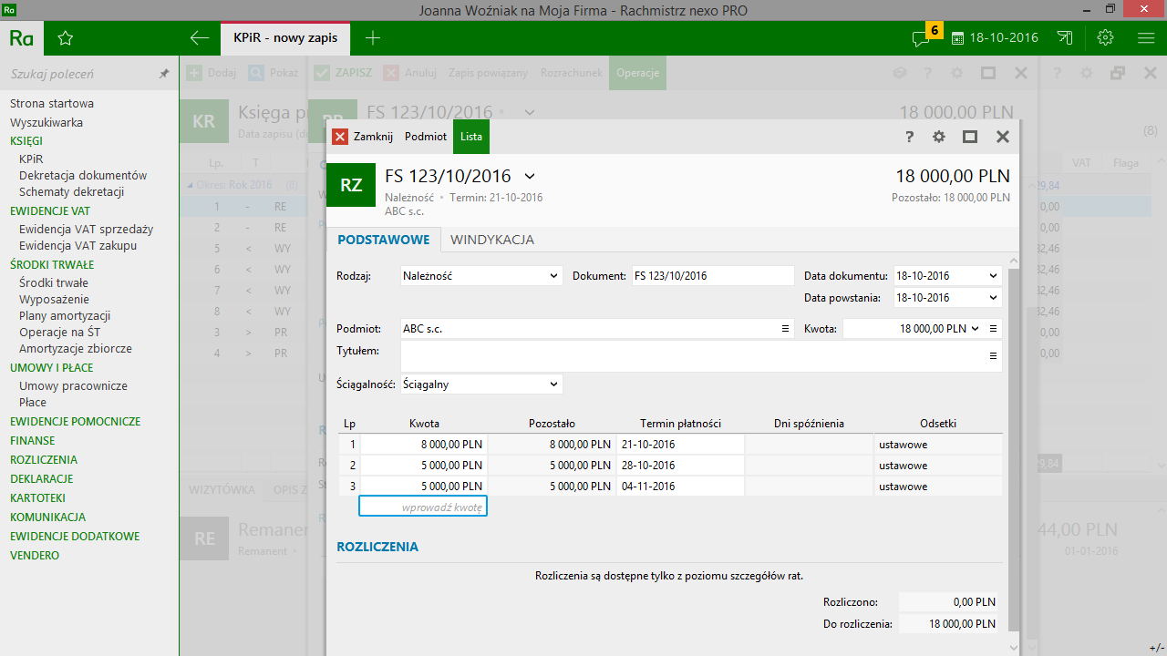 - możliwość podzielenia rozrachunku na raty (rozrachunek może być podzielony na wiele kwot cząstkowych z określeniem terminu płatności dla każdej z nich);