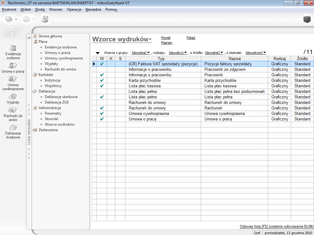 - rozbudowana obsługa wynagrodzeń: ewidencja osobowa, umów cywilnoprawnych oraz umów o pracę; wystawianie rachunków do umów cywilnoprawnych oraz wypłat (w tym możliwość automatycznego wyliczania na podstawie zdefiniowanych schematów wynagrodzeń);