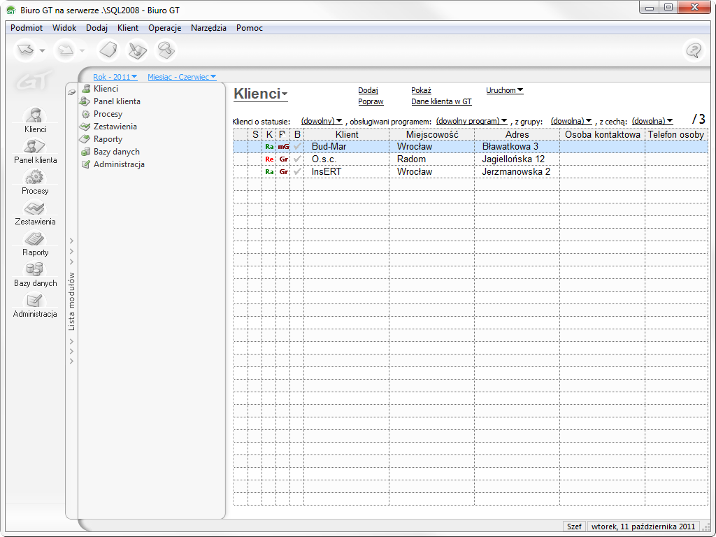 - zarządzanie listą podmiotów obsługiwanych przez biuro;